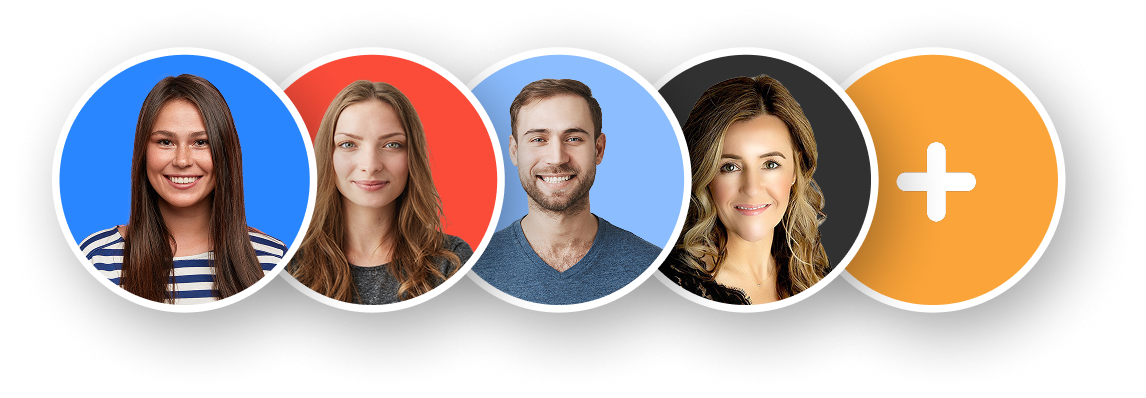 Group of five diverse women smiling and looking down at the camera in a circle.